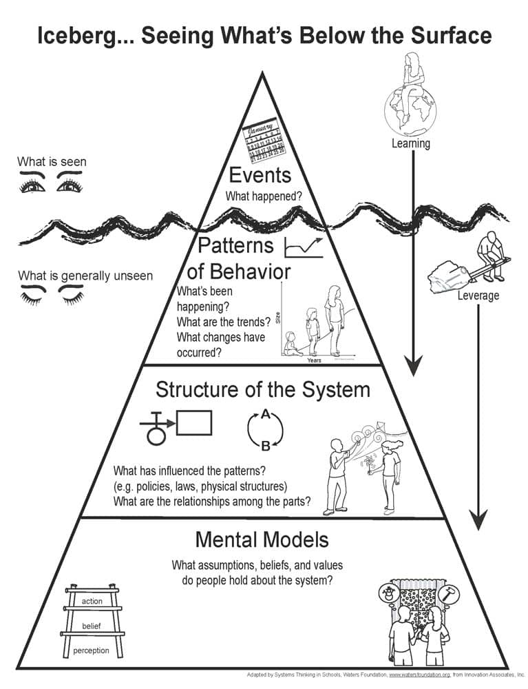 This model has four layers: the surface of events, patterns of behavior, structures, and mental models.